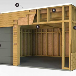 Доски для верховой обвязки располагают с некоторым зазором для того, чтобы туда можно было вставить стойку. Сами стойки каркаса следует расставить по всему периметру будущего гаража с шагом метр- полтора. Для того, чтобы скелет гаража получился прочным, используют дощатые подкосы, которые врезают в зазоры на верхней обвязке и примерно равные ширине используемых досок. Врезка происходит особыми острыми шипами, а также строительными гвоздями, стальными якорьками или прочными скобами.